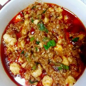 1.大火起油锅,油至七分热时下葱姜末,炒匀后下郫县豆瓣酱,翻炒出红油;2.肉糜下锅大火翻炒片刻,淋入适量料酒继续翻炒至肉糜断生,撒入花椒;3.加少量糖、盐(视咸味程度可不加),煸炒均匀后,将沥干水的豆腐块下锅,小心划动至每一块豆腐都裹上红油;4.加水或高汤至没过豆腐,小心划动至汤、料均匀,加盖,闷制二十分钟。