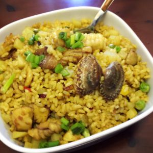 11、配料炒好,下冷饭和切成小块的土豆炒匀,再放适量的咖喱粉、盐、鸡精、黑胡椒调味即可。