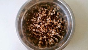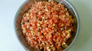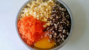 把玉米粒,胡萝卜,香菇加上一只鸡蛋,倒入肉馅
