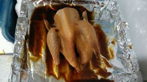 用酱油,红烧汁,料酒,蜂蜜,盐,搅拌腌鸡,腌2小时以上(有条件的多腌几小时),鸡事先用牙签扎孔。