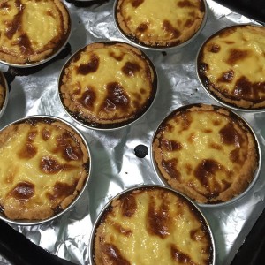 按一个面团一个模具的方法,沿着模具中心沿两边按压,制成挞皮,为了方便之后的制作,把做好的挞皮模具直接放在垫上锡纸的烤盘(这样便于移放,同时可防止蛋液流出弄脏烤盘)