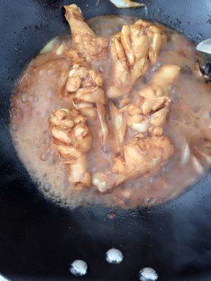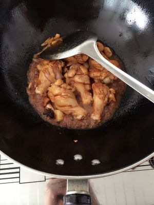 把葱姜蒜放入锅中,炒出香味,放入鸡腿,加料酒,老抽,炒至变色