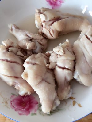 鸡腿洗干净后用开水焯一下,捞出用刀划几刀