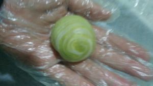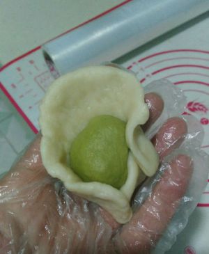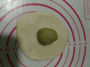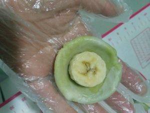 将面片翻面(没有花纹的一面朝上)包好香蕉,像包包子那样封口。