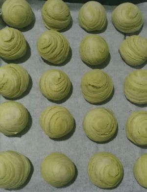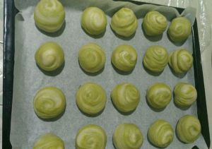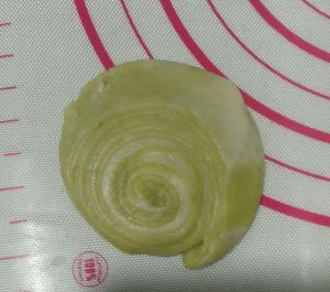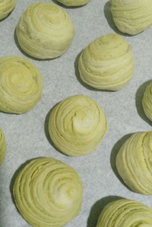 平整地放置在铺了油纸的烤盘上,每个面团之间留点空隙(这个不会发很大,但是随着温度上升,酥皮会一层一层像开花一样展开,太挤了会碎掉),放入预热好的烤箱,上下火180度,20-25分钟,期间仔细观察,如有变色,加盖锡纸。