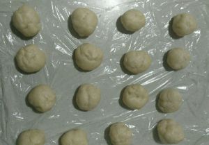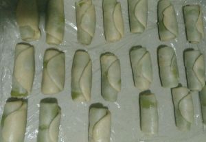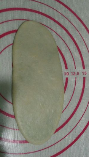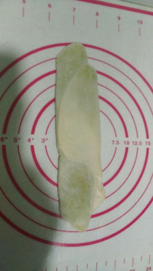 用擀面杖(我用的保鲜膜卷,一点儿也不粘)擀成牛舌装。