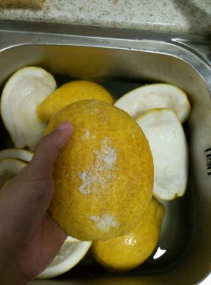 用盐清洗柚子表皮,搓搓搓!(无视我的图…我妈为了吃这个买了4-5个柚子…全解剖啦)