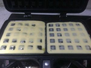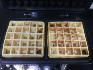 预热华夫饼模具,打开盖倒入适量糊糊。盖上盖子,加热。期间可以听到滋滋滋的声音,当声音变低就可以翻面加热了。我用的是双华夫模具所以要左右都分别加热