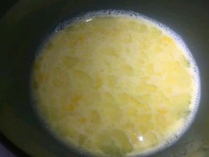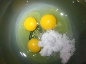 将3个鸡蛋,50g细砂糖和2g盐放入,用筷子搅拌