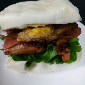 把馒头对半切,把生菜,鸡蛋,火腿,鸡腿肉摆好,就轻松搞点了