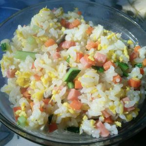 先炒蛋黄,打散,到米饭,再放红萝卜丁,黄瓜丁,香菇丁,火腿丁,最后放盐,关火。
