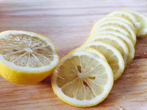 柠檬洗净擦干,砧板也需要擦干没有水份哟