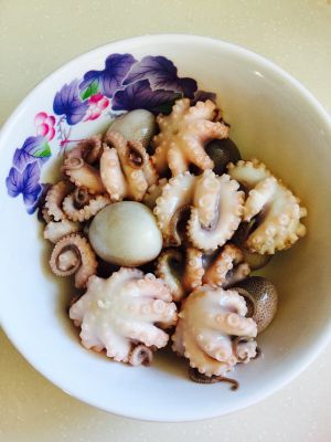 锅里放水,料酒,盐,水开后,放入八爪鱼,30秒捞出,立即用凉水冲过,备用。