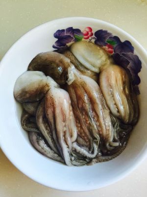 新鲜八爪鱼去掉爪子中间的黑色小花状东西,剪掉双眼,洗净。