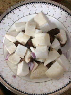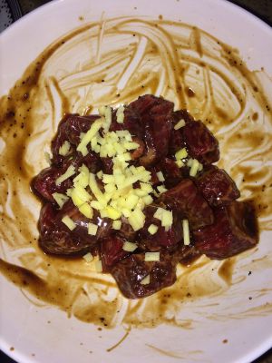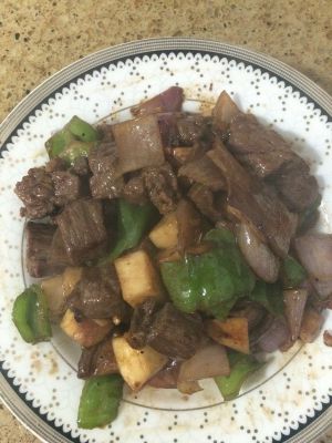 牛肉切丁清水浸泡一小时后,用胡椒汁蚝油料酒姜腌制30分钟入味。