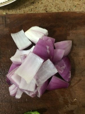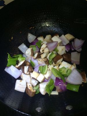 另起油锅,放入杏鲍菇、香菇、洋葱、辣椒翻炒3、4分钟。