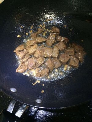 油锅加热,放入腌制好的牛肉粒爆炒两分钟,起锅。