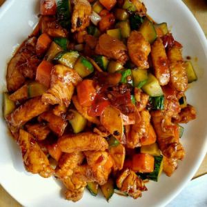 放入鸡丁、胡罗卜丁、黄瓜丁,翻炒收汁,加少许盐,即可出锅。