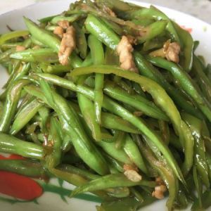 翻炒约5分钟,至四季豆完全断生变软之后,放入之前炒过的瘦肉丝翻炒。