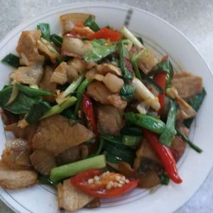 锅内放少量油,爆炒肉片,成稍卷,放豆瓣酱,炒香,放白糖,生抽,醋。翻炒。入味,再放姜片尖椒,泡椒翻炒。
