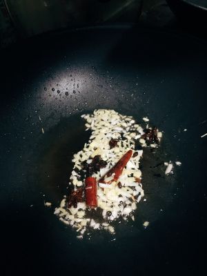 锅里下生姜片儿,拍了的蒜瓣儿(不能向我做蒜末)八角,桂皮炒香。下冰糖炒化。
