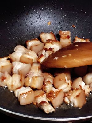 加入五花肉煎至两面金黄,加入老抽上色,生抽,盐,鸡精。加水没过五花肉,大火烧开,小火慢炖。