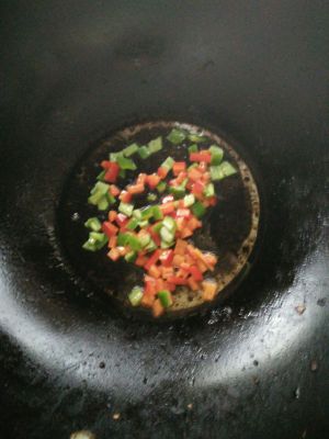 另起一锅,倒油烧红,将青椒和红椒倒入翻炒