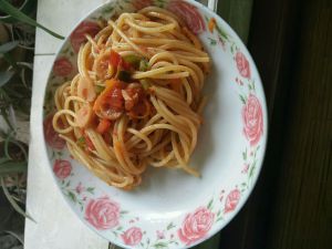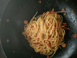 最后将意大利面倒入锅中,将番茄汁吸收,再加火腿继续翻炒2~3分钟