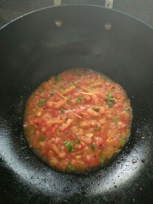 后加入胡萝卜炒半分钟,最后倒入西红柿一起翻炒