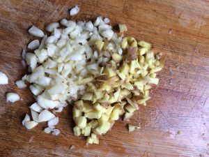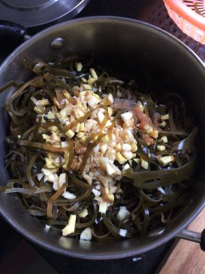 把沥干的海带放入容器中,倒入小碗的酱汁,撒上姜和蒜,用筷子搅拌均匀