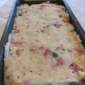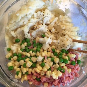把准备好的甜玉米粒,豌豆粒,和肉倒进土豆泥。加盐,蒜粉,黑胡椒粉,拌匀。尝尝土豆泥的味道是否够足,现在的咸淡和烤出来的咸淡几乎是一样的。