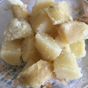 洗干净的马铃薯切两瓣或四瓣以后上锅蒸熟(也可以煮,但是水分可能会大一点),蒸到拿根筷子不费力的就可以插到底的时候就可以了。这时候皮就很容易就拨下来了。再切小块一点方便碾碎。