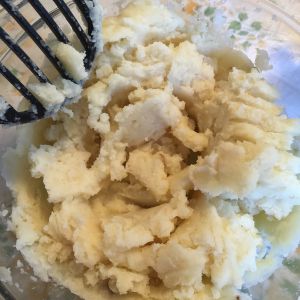 把牛奶和奶油放微波炉打热,直到奶油化了为止。然后一点一点倒进土豆泥直到满意的湿度为止。(这里用脱脂前的牛奶味道会浓一些)