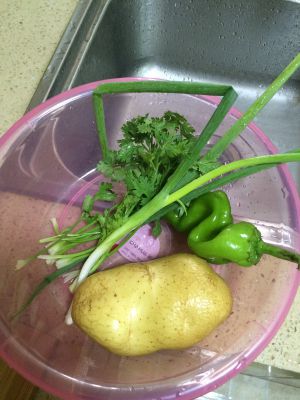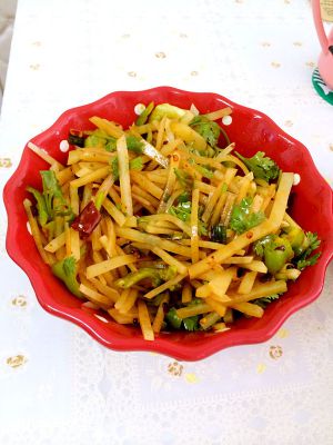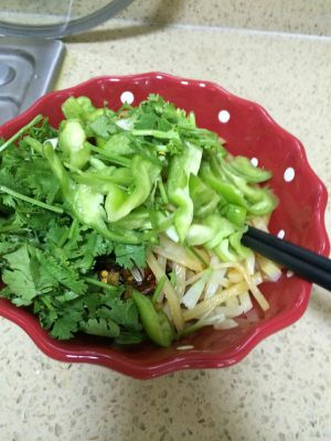 将辅材倒入土豆丝中,并加入青椒和香菜拌匀。