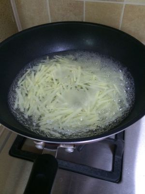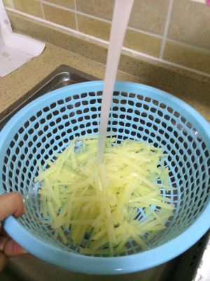 土豆丝放锅里焯水,直到土豆丝熟为止。