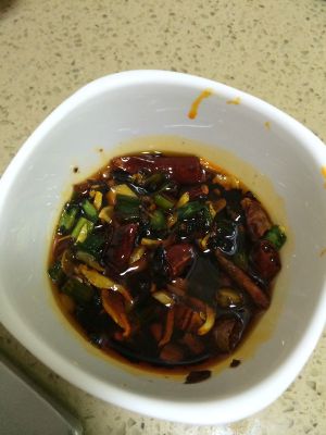 有香味后,倒入一小碗中。倒入适量盐,酱油,香油,老干妈搅拌。