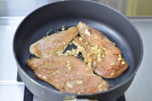将鸡胸肉和酱汁一起倒入锅中,盖上锅盖小火慢煎,全程盖锅盖哦