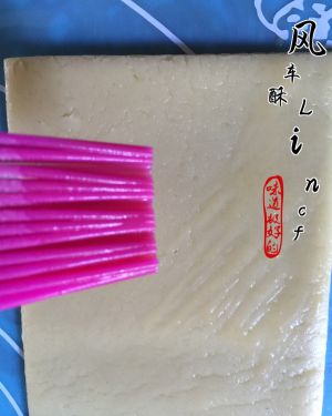 把原味面团擀成片,切成方形,上面刷上全蛋液