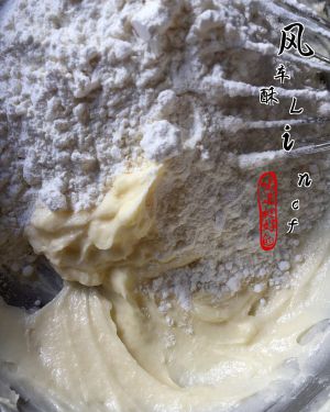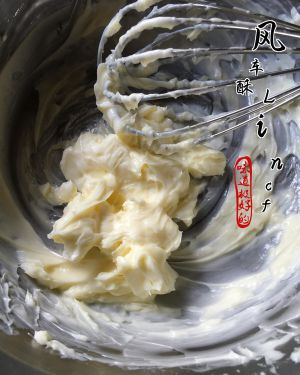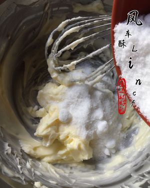 2、软化后的黄油,加入糖粉,用手动打蛋器搅匀(不需要打发)