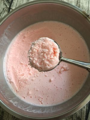 这是放在冰箱冷冻了一晚上的草莓味酸奶冰淇淋!