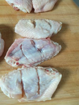 喜欢吃翅中的我买了六个翅中,用水泡后冲净血水,控干水,在案板上用刀划两道
