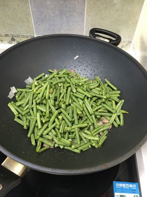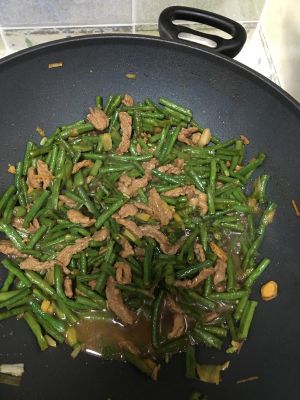 在炒熟的牛肉中放入豆角,生抽,炒熟,放盐