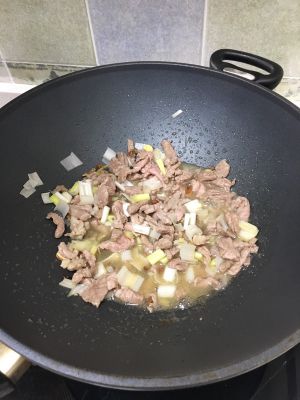 将锅中放入油,大料,葱姜,再加入牛肉炒熟