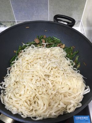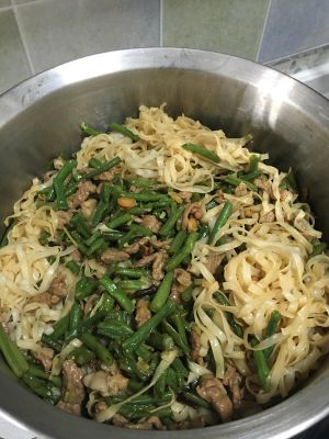 将蒸好的面条与炒好的豆角牛肉拌在一起