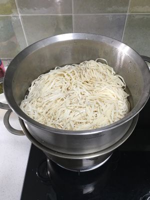 将鲜面条放入篦子上,下面加水,中火,开锅后再蒸10-15分钟。