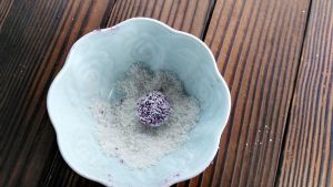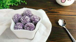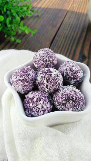 取少量紫薯泥,搓成小圆球。紫薯球表面均匀滚上椰蓉。(可以戴上一次性手套)