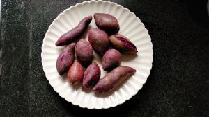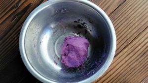 将蒸熟的紫薯去皮,压成泥。加入少量的牛奶,和成软硬合适的紫薯泥。