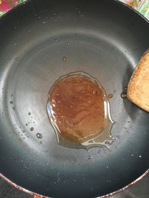 锅里倒入少许油加入两勺白糖,小火慢慢的熬成焦糖色!