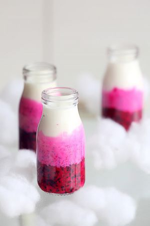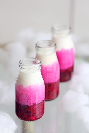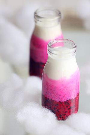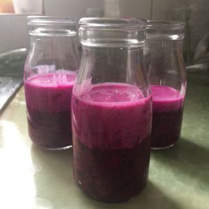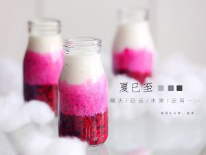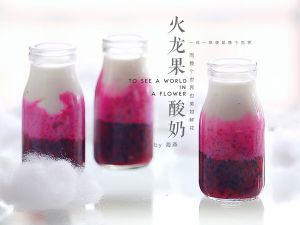 先倒入一部分火龙果泥到杯中,可以根据口味添加蜂蜜