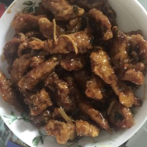 重新起锅,热油,放葱姜爆炒一下出香味,倒入调好的糖醋汁,一点水淀粉(帮助收汁),炸好的里脊倒入,裹上糖醋汁,稍微翻炒一下,出锅~